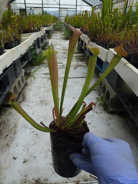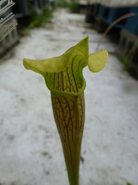 原種系のサラセニアで、草丈が比較的高くなるタイプです。葉は黄緑色で細長く、まっすぐに立ち上がります。