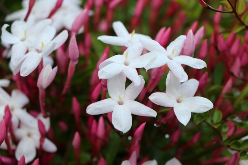 ハゴロモジャスミンは、中国雲南省が原産で白色や薄ピンク色の花を咲かせます。ジャスミンの品種の中でも香りが強く、人気の高い品種です。