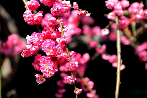 しだれ梅は、枝が垂れ下がるように伸びていくのが特徴です。紅色の花を咲かせる「紅枝垂(べにしだれ)」や、真っ白な花が下向きに咲く様子を滝に見立てた「白滝枝垂(しらたきしだれ)」など、たくさんの種類があります。