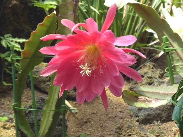 クジャクサボテンは、大型のものでは1mを超えて成長します。風などで倒れないように、成長にあわせて支柱かあんどん支柱を立てましょう。