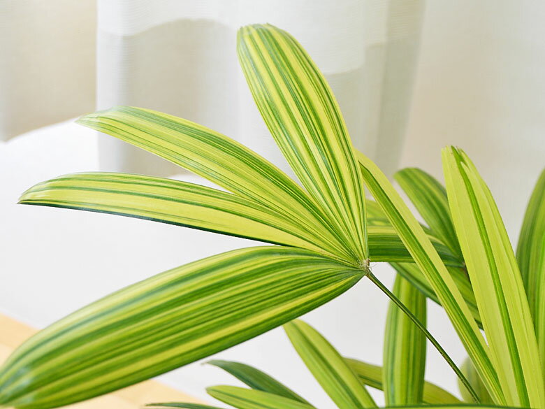 カンノンチク(観音竹)は、シュロチクによく似た近縁種です。葉の切れこみ数が少なく、葉幅が広いのが特徴です。やや小ぶりで、園芸品種も多くあります。