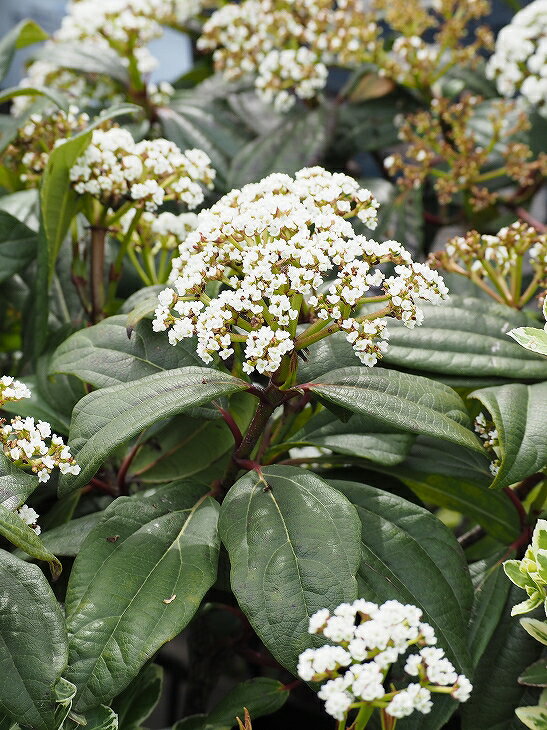 中国東部原産のビバーナム・カールセファラムは、オオチョウガマズミとの交配種です。カールセファラムは、中国では庭木の定番として親しまれています。春には白い花を密に咲かせ、花からは甘い香りがします。レンプクソウ科に属していますが、性質はスイカズラ科のスノーボールに似ていて落葉性です。