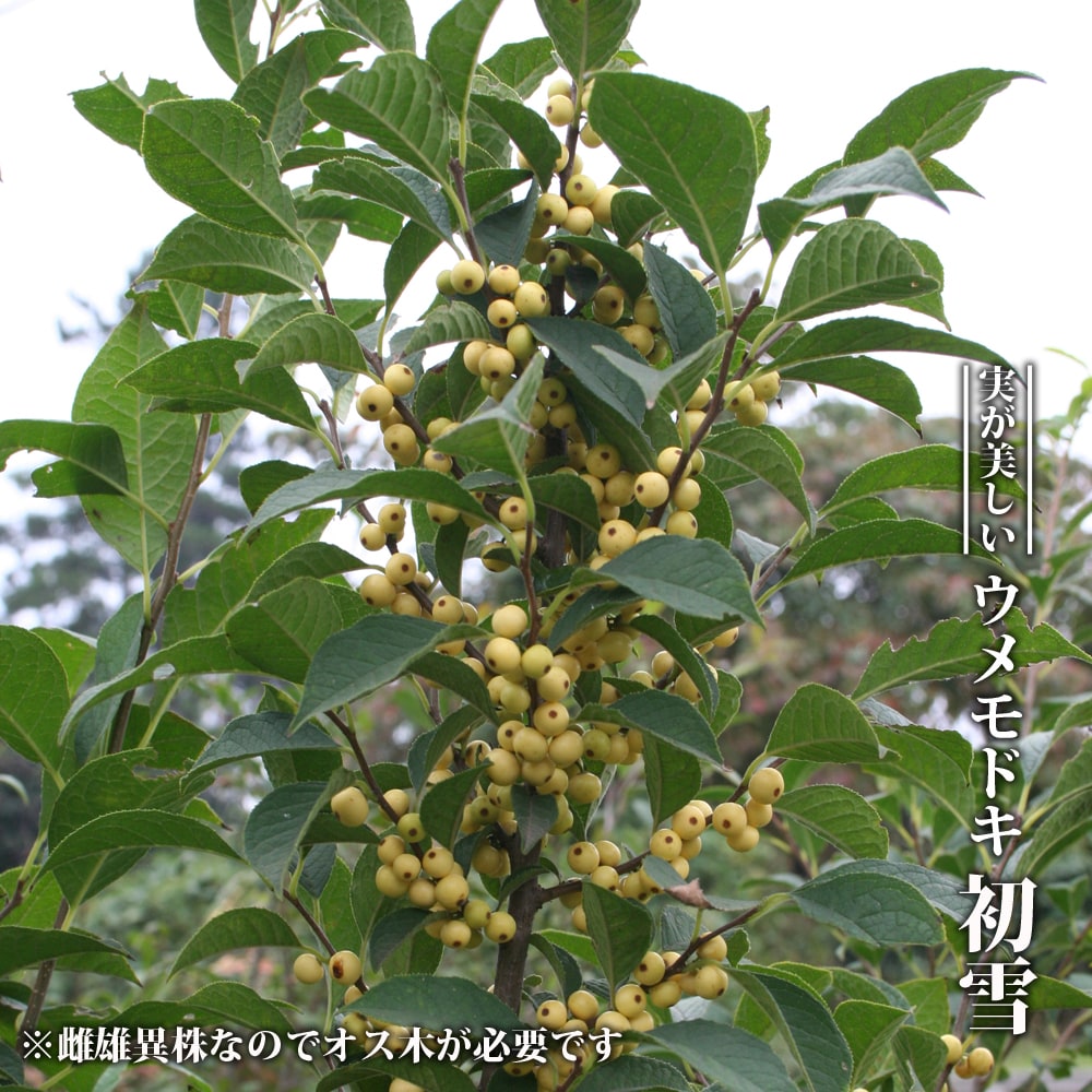 ウメモドキは赤色の実をつける品種がほとんどですが、初雪は秋に白色の実をつける珍しい品種です。切り花や、床の間に飾る生け花にも利用されています。