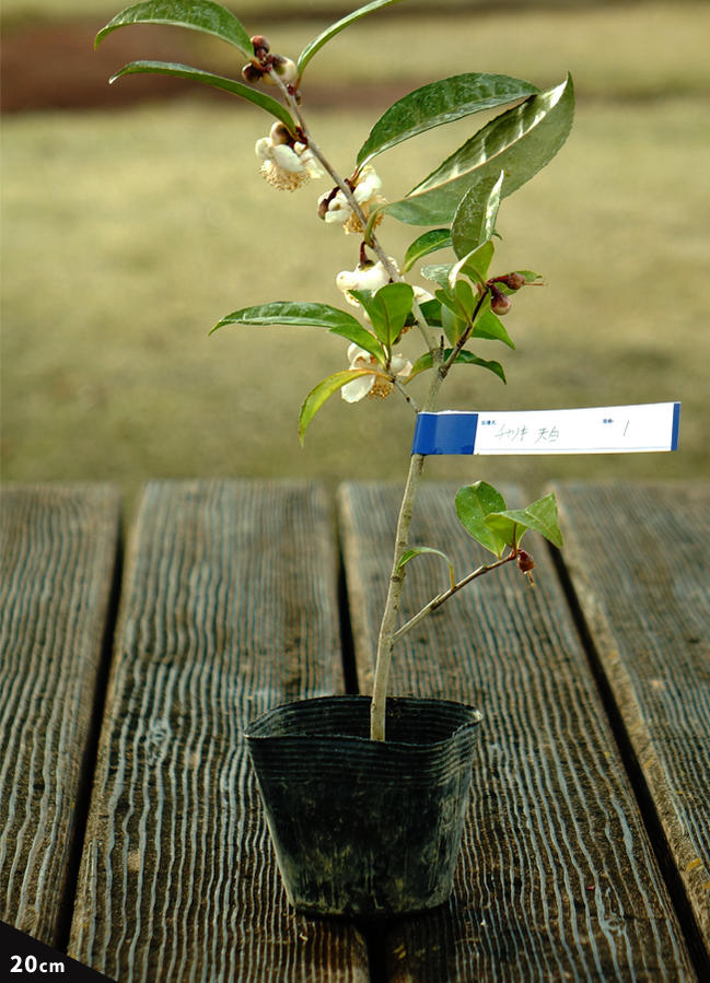 天白は、チャノキの品種の中でも3cm〜4cmほどの大きな花を咲かせる「大輪種」です。あまり流通していない希少種で、苔玉などを使用すれば室内で盆栽としても育てられます。